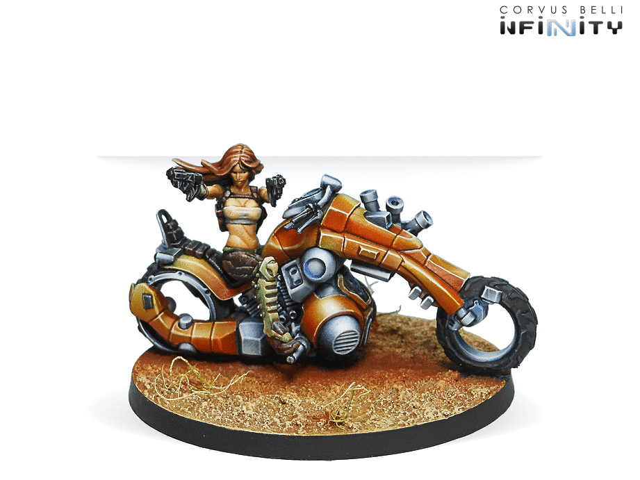 La madre de las gemelas fue una de las víctimas de la bomba génica lanzada por la banda de los Rudeboys de Kazdhan durante las Luchas de Bandas de la Primavera Roja. Uno de los efectos secundarios de este artefacto era que sólo podía dar a luz a niñas, un duro castigo en una sociedad tan masculina como la de las bandas de las cordilleras de Tien Shan. Como primogénitas, Zamira y Zuleyka se pasaban el día peleando con los demás niños para proteger a sus hermanas pequeñas. Hasta que crecieron y se dieron cuenta de que había un modo más sencillo de dominar físicamente a sus adversarios, especialmente a los hombres. Pero en el norte de Gabqar no eres nadie si no tienes un buen par de ruedas y un montón de amigos bien duros que te acompañen. Para las Gemelas Nazarova era fácil conseguir una moto y a un bandarra bien cabronazo que las llevara y protegiera, pero convertirse en el paquete de un motero cualquiera no era su idea sobre cómo triunfar en la vida. Estas nenas aspiraban a lo más alto, ellas querían dominar una banda, la más grande de todas, al igual que dominaban a cualquier hombre. Así, pateando y seduciendo, se convertirían en escoltas-concubinas de Radbuk Beg, el líder de los Satánicos de Irfaz. Y se dice que fueron las culpables de su muerte y de la destrucción de los Satánicos a manos de Izzat Beg cuando éste se encaprichó de ellas. De este modo, las dos gemelas se convirtieron en las concubinas favoritas del rudo y veterano Izzat Beg, el mayor de los líderes Kum. Pero esto seguía sin ser suficiente para las sensuales y ávidas Gemelas Nazarova. Izzat era perro viejo y no se dejaba dominar tan fácilmente como el necio de Radbuk. Así que todos aquellos que las conocían bien no se sorprendieron cuando Kasym Beg, el hijo adoptivo de Izzat Beg, tan feroz como su padre, pero más joven y manipulable, se hizo con el poder y las convirtió en sus consejeras y amantes. Aquello fue un auténtico golpe de estado, ejecutado con maneras masculinas pero orquestado con inteligencia femenina. Aunque no te creas que alguien se atrevió a desafiarlas, eso implicaría una lucha en la arena contra ellas, y pocos son los que pueden derrotarlas en sus propios términos. Ahora las verás siempre detrás de Kasym Beg, cubriéndole las espaldas en la carretera y susurrando palabras melosas en su guarida, gobernando con sutileza desde las sombras, como a ellas les gusta. Pero, ahora que están tan cerca del trono, ¿será suficiente para estas dos gemelas ávidas de poder? ¿Se conformarán con una posición secundaria? ¿O aspirarán a algo más?