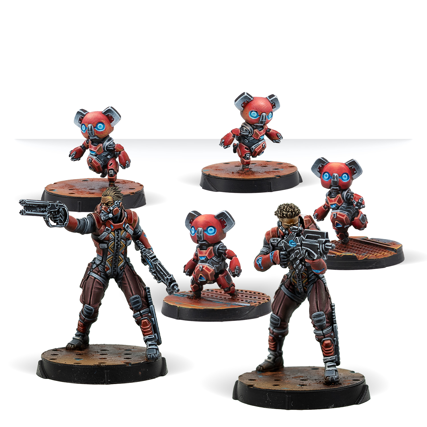 Esta caja incluye 6 miniaturas: Un Moran con Fusil Combi, un Moran con Escopeta de Abordaje y 4 CrazyKoalas. Si lo que buscas es un potente control de mesa, los Moran Maasai son la mejor elección. Sus CrazyKoalas frustraran el avance enemigo y su Repetidor ampliará el radio de efecto de tus Hackers.